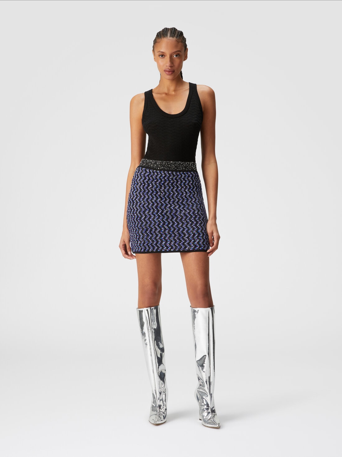 Il design che sottolinea la silhouette caratterizza la minigonna con elatico in vita. Realizzato in maglia di misto viscosa, il modello è impreziosito dalla particolare lavorazione a zig zag ritorto, accesa dai magliori del motivo fiammato lamé.